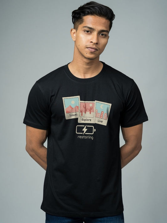 Roads to India® Cotton T-Shirt for Men – Restore Your Soul Graphic Print Tee | Half Sleeve Round Neck | Unisex Regular & Oversized Fit | 180/220 GSM | Red, Navy Blue, Grey, Black | S to 5XL