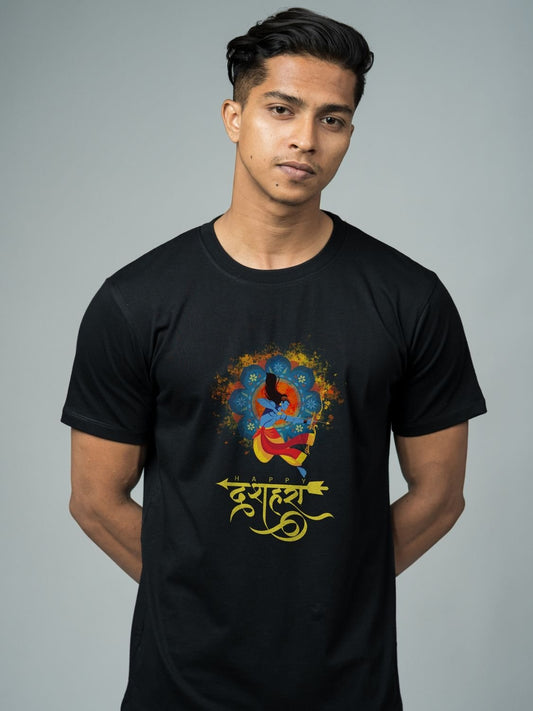 Roads to India® T-Shirt for Men – 100% Cotton Happy Dussera Half Sleeve Round Neck Graphic Print Tee | Unisex Regular & Oversized Fit | Unisex 180/220 GSM | S–5XL | Black, Navy Blue, Olive Green
