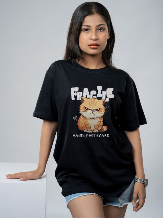 Roads to India® Women's Pure Cotton Casual T-Shirt – Fragile - Handle With Care Graphic Tee | Unisex Fit (Regular & Oversized) | 180/220 GSM | Half Sleeve, Round Neck | S–5XL | Black, Navy Blue, Red, Yellow