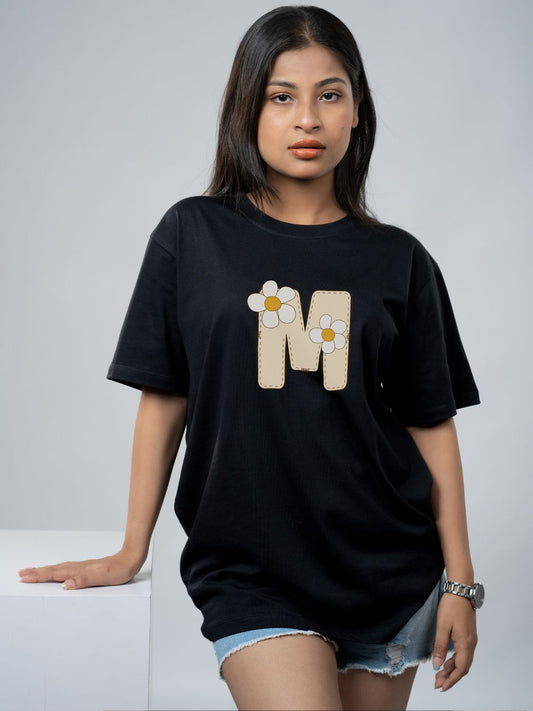 Roads to India® Women's Pure Cotton Casual T-Shirt – M-Name Art Alphabet Graphic Tee | Unisex Fit (Regular & Oversized) | 180/220 GSM | Half Sleeve, Round Neck | S–5XL | Black, Navy Blue, Red