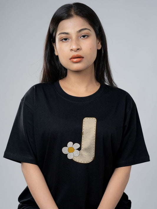 Roads to India® Women's Pure Cotton Casual T-Shirt – J-Name Art Alphabet Graphic Tee | Unisex Fit (Regular & Oversized) | 180/220 GSM | Half Sleeve, Round Neck | S–5XL | Black, Navy Blue, Red