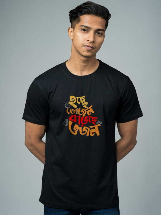Roads to India® Bengali T-Shirt for Men – 100% Cotton Hocche Bhojon Barche Ojon Bengali T-Shirt | Round Graphic Print Neck Half Sleeve | Unisex Regular & Oversized Fit | 180/220 GSM | S–5XL | Black