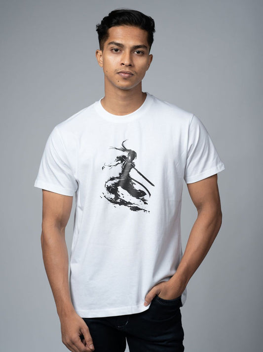 Roads to India® Pure Cotton Casual T-Shirt – Anime Samurai Graphic Tee | Unisex Fit (Regular & Oversized) | 180/220 GSM | Half Sleeve, Round Neck | S–5XL | White