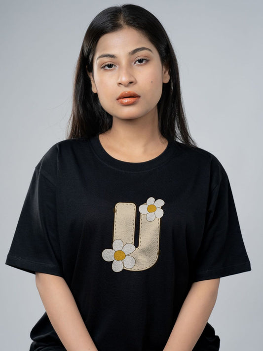 Roads to India® Women's Pure Cotton Casual T-Shirt – U-Name Art Alphabet Graphic Tee | Unisex Fit (Regular & Oversized) | 180/220 GSM | Half Sleeve, Round Neck | S–5XL | Black, Navy Blue, Red