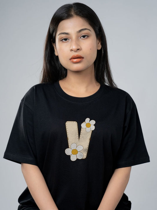 Roads to India® Women's Pure Cotton Casual T-Shirt – V-Name Art Alphabet Graphic Tee | Unisex Fit (Regular & Oversized) | 180/220 GSM | Half Sleeve, Round Neck | S–5XL | Black, Navy Blue, Red