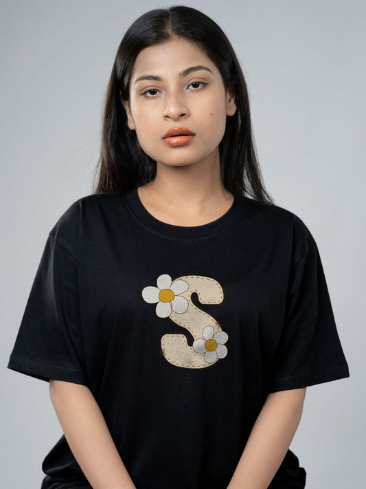 Roads to India® Women's Pure Cotton Casual T-Shirt – S-Name Art Alphabet Graphic Tee | Unisex Fit (Regular & Oversized) | 180/220 GSM | Half Sleeve, Round Neck | S–5XL | Black, Navy Blue, Red