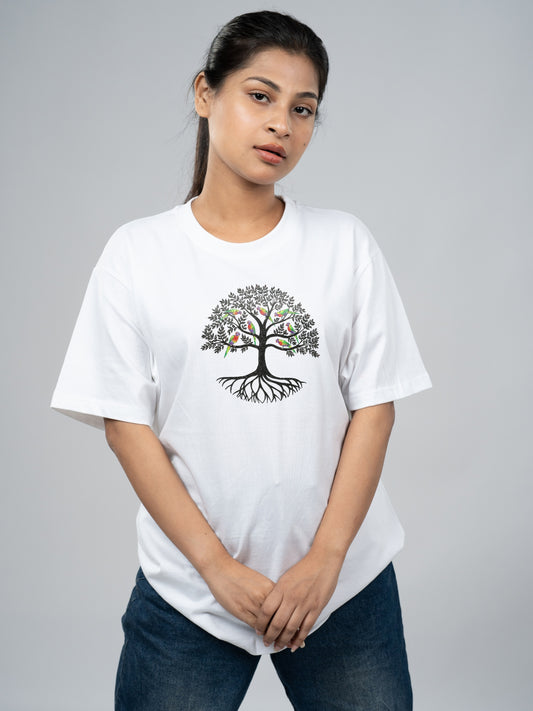 Roads to India® Women's Pure Cotton Casual T-Shirt – Tree of Life Graphic Tee | Unisex Fit (Regular & Oversized) | 180/220 GSM | Half Sleeve, Round Neck | S–5XL | White
