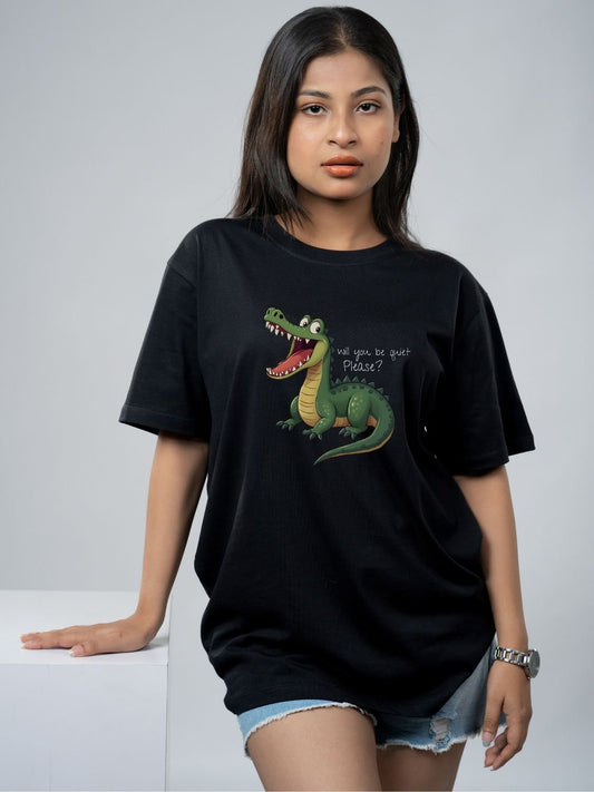 Roads to India® Women's Pure Cotton Travel T-Shirt – Crocodile Graphic Tee | Drop Shoulder, Women's Fit (Regular & Oversized) | 180/220 GSM | Half Sleeve, Round Neck | Sizes S–5XL | Black