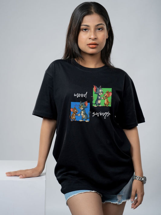 Roads to India® Women's Pure Cotton Travel T-Shirt – Mood Swing Graphic Tee | Drop Shoulder, Women's Fit (Regular & Oversized) | 180/220 GSM | Half Sleeve, Round Neck | Sizes S–5XL | Black, Blue, Red