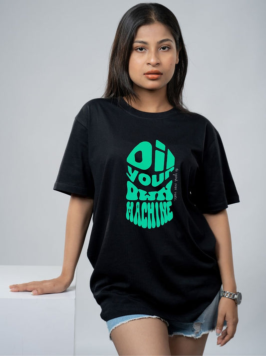 Roads to India® Women's Pure Cotton Travel T-Shirt – Oil Your Own Machine Graphic Tee | Drop Shoulder, Women's Fit Regular & Oversized | 180/220 GSM | Half Sleeve, Round Neck | S–5XL | Black, Nevy Blue