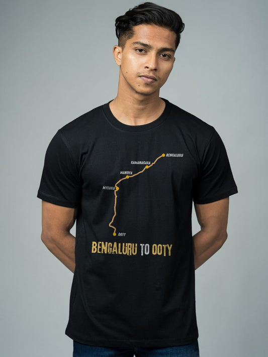 Roads to India® Men's Pure Cotton Travel T-Shirt – Bengaluru to Ooty Roadmap Graphic Tee | Unisex Fit (Regular & Oversized) | 180/220 GSM | Half Sleeve, Round Neck | S–5XL | Black, Navy Blue
