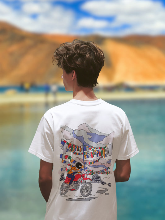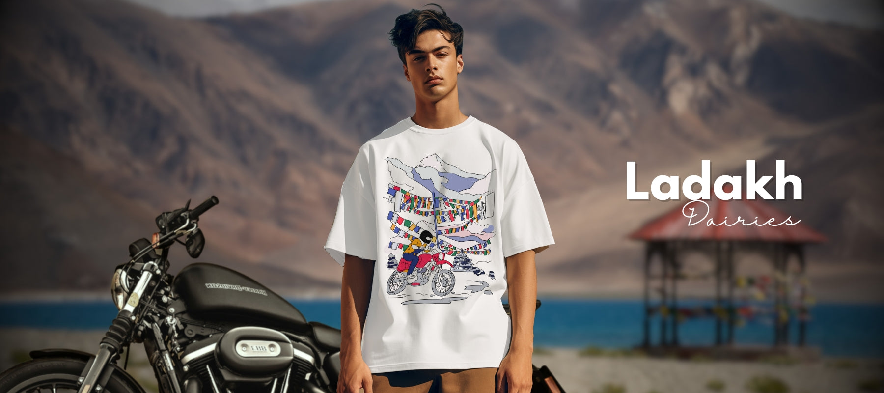Roads to India Travel Tees - Ladakh Motorcycle Adventure Unisex Oversized T-Shirts - Half Sleeve Crew Neck - 100% Combed Cotton, Sustainable Ink Print, BioWashed, Side-Seamed, Graphic Printed