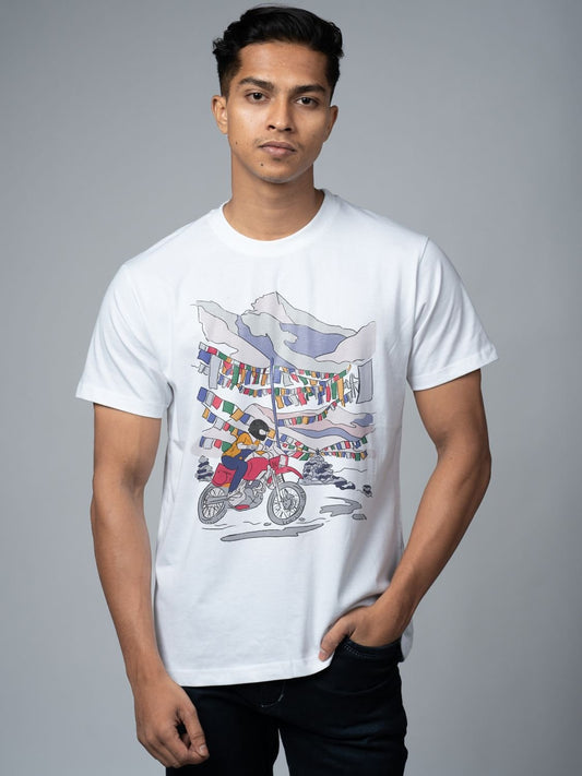 Roads to India® Men's Cotton Trekking T-Shirt – Ladakh Adventure Graphic Tee | Unisex Fit (Regular & Oversized) | 180/220 GSM | Half Sleeve, Round Neck | S–5XL | White