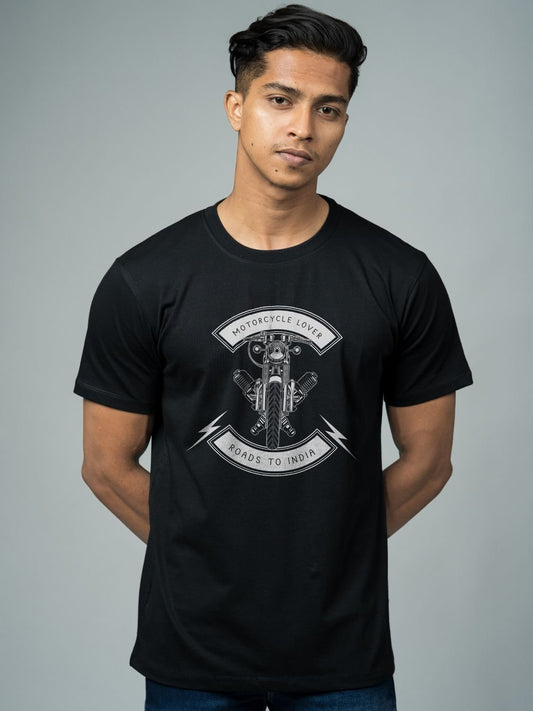 Roads to India® T-Shirt for Men – 100% Cotton Motorcycle Lover Half Sleeve Round Neck Graphic Print Tee | Regular & Oversized Fit | 180/220 GSM | S–5XL | Navy Blue, Red, Olive Green, Black
